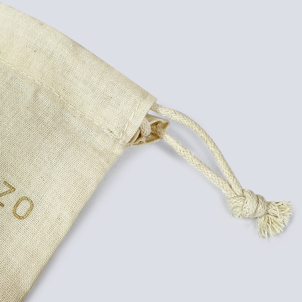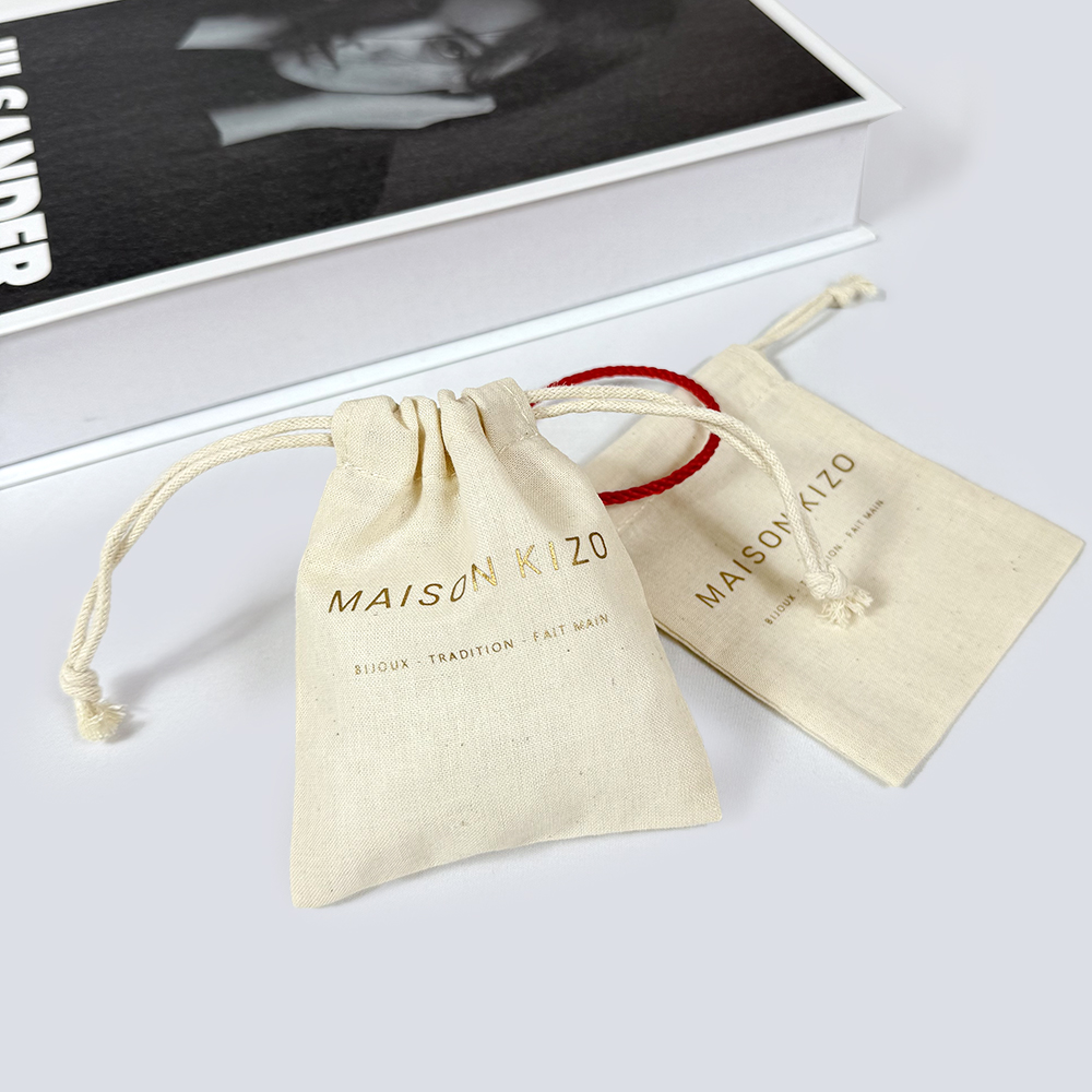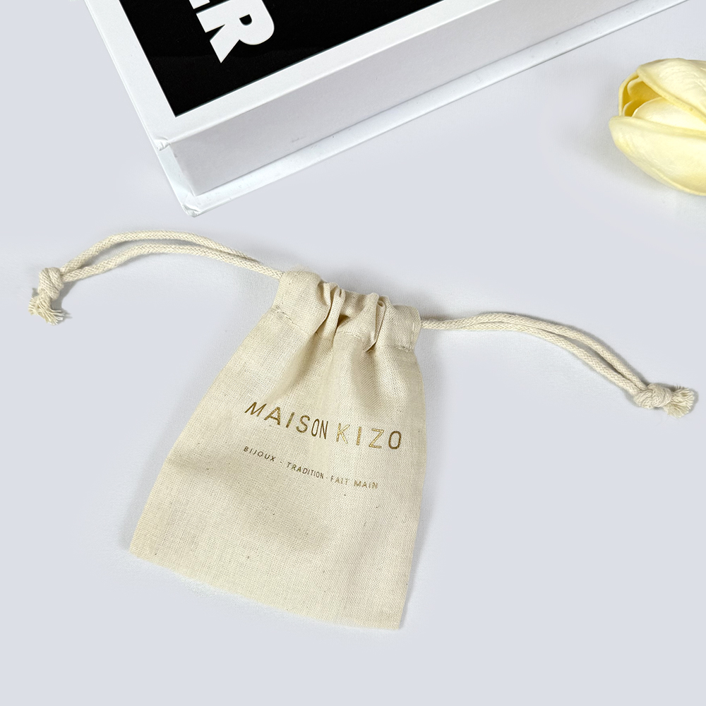 This elegant organic cotton drawstring bag provides a soft and protective storage solution for your precious jewelry pieces like necklaces, rings, and earrings, featuring a luxurious gold silk-screen logo prominently displayed on the front and complemented by matching durable fine round gold cotton drawstrings that ensure secure closure and easy access, making it ideal for safekeeping, travel, or as a stylish gift presentation bag that perfectly combines practicality with a touch of sophistication