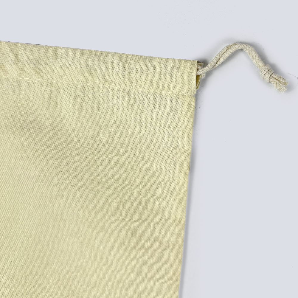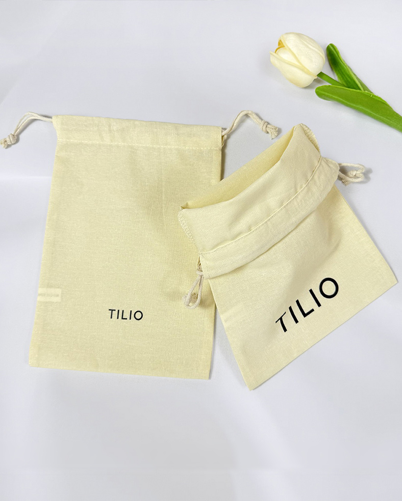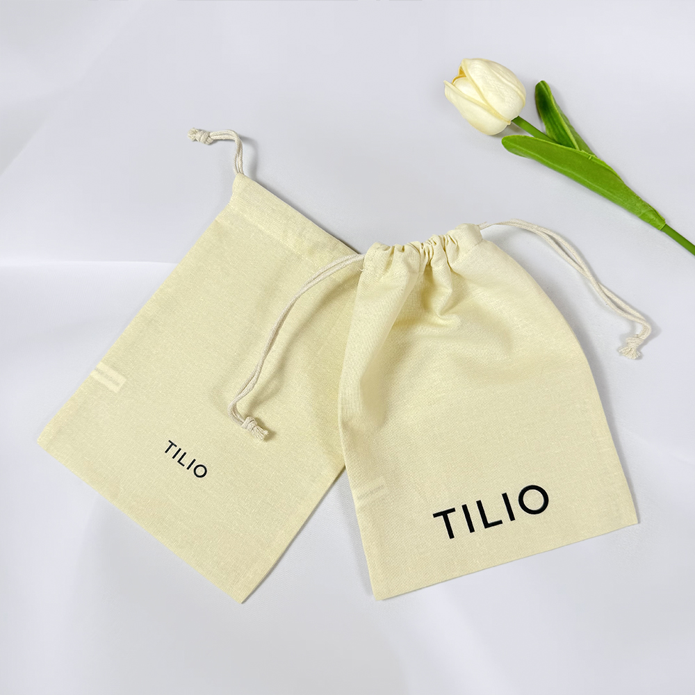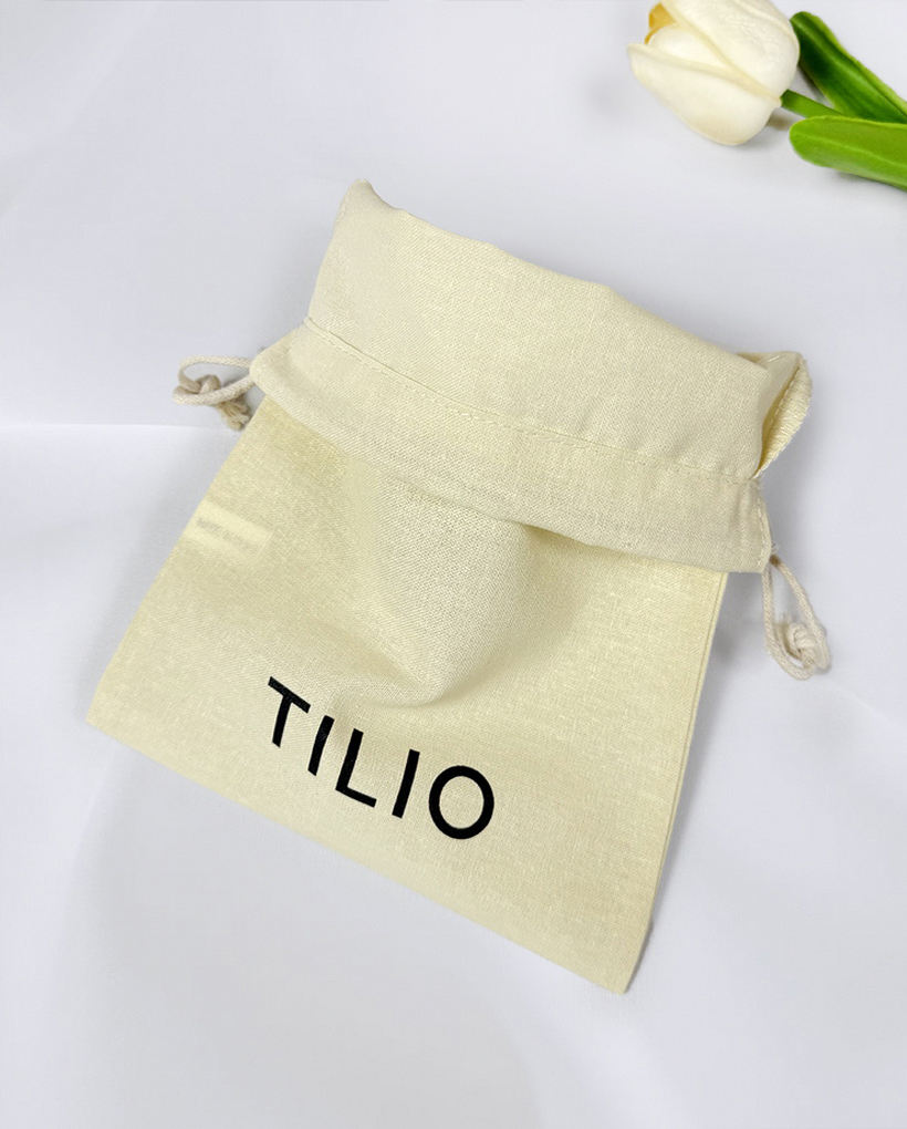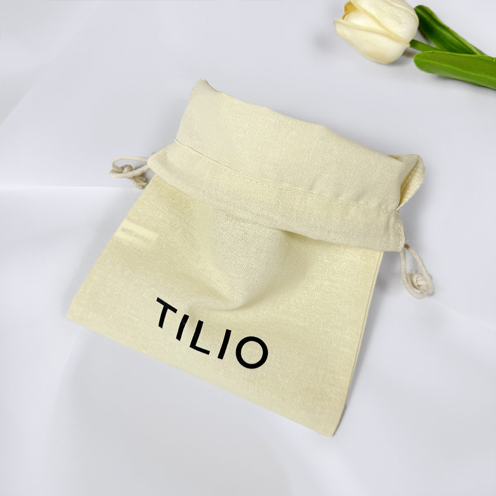 Store your jewelry, rings, necklaces, and accessories securely in this versatile beige cotton drawstring pouch, featuring a durable black silk-screen logo for a clean aesthetic and finished with a matching beige fine round cotton drawstring to keep contents safe while offering easy access, perfect for everyday storage, travel organization, or as an elegant reusable gift bag