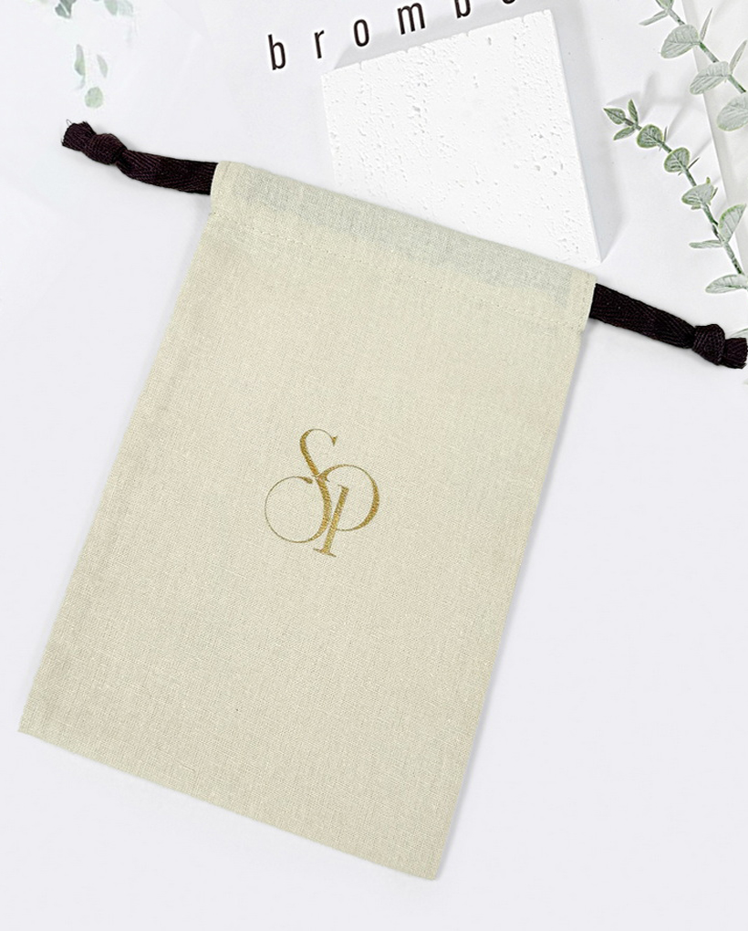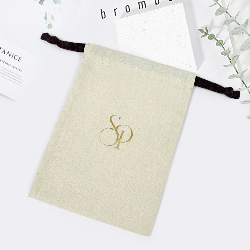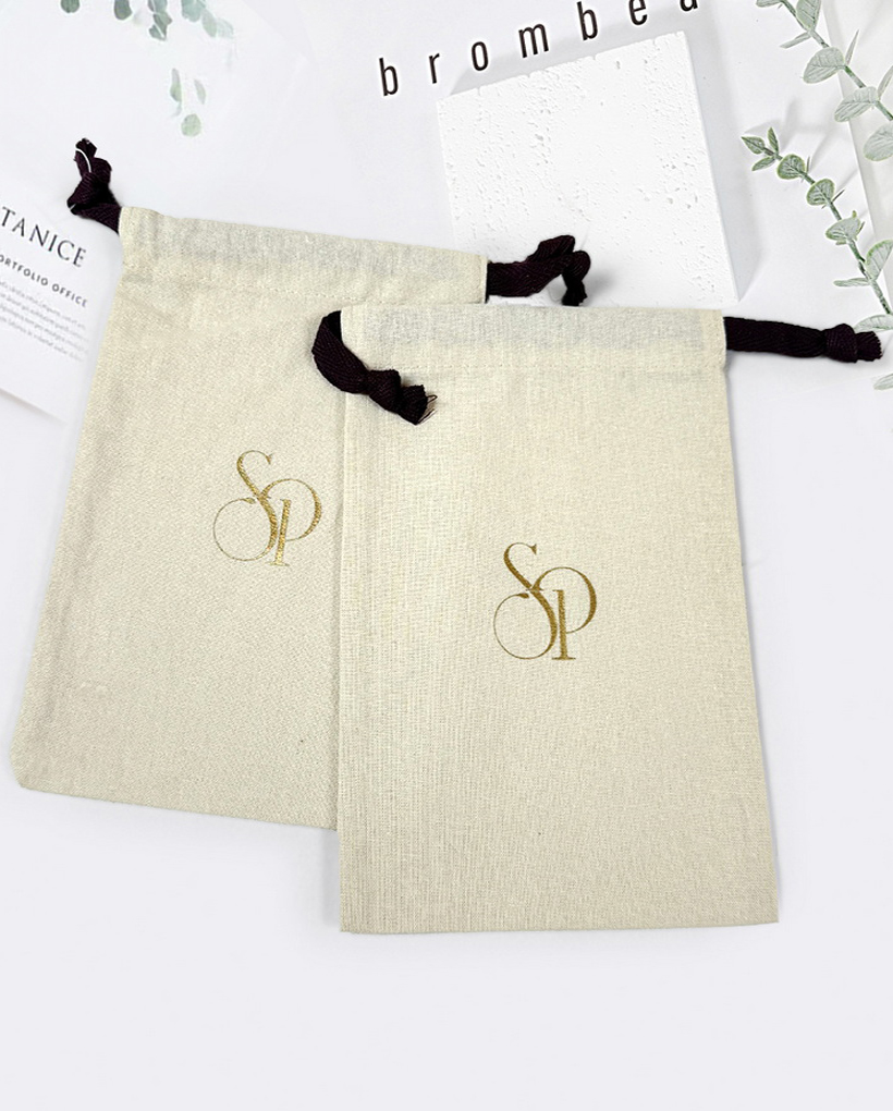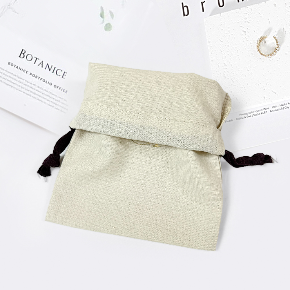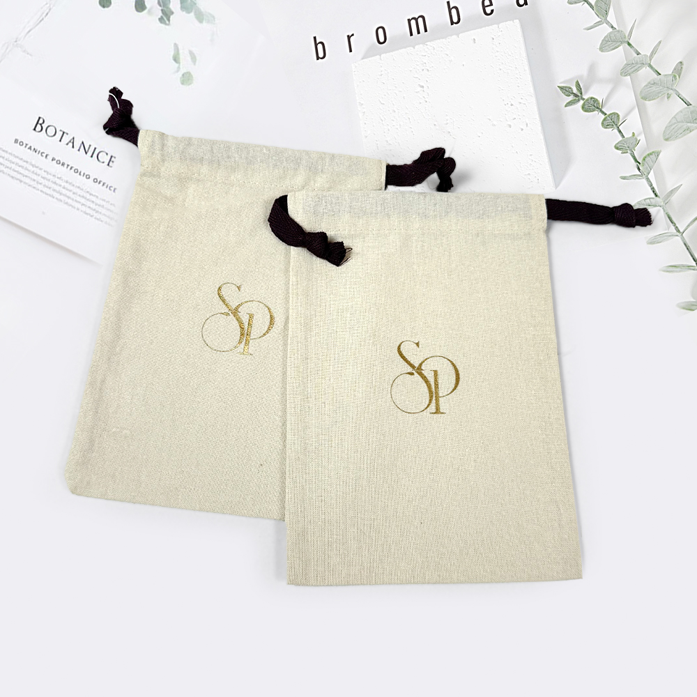 Discover our exquisite beige drawstring dust bag, crafted from high-quality cotton and designed to offer both protection and style for your precious items, featuring a practical black cotton drawstring that ensures secure closure and a striking gold logo that adds a touch of sophistication, making it an ideal reusable protective cover for jewelry, watches, scarves, luxury accessories, or as an elegant branded packaging solution for gifts, embodying a perfect blend of functionality and beautiful design.