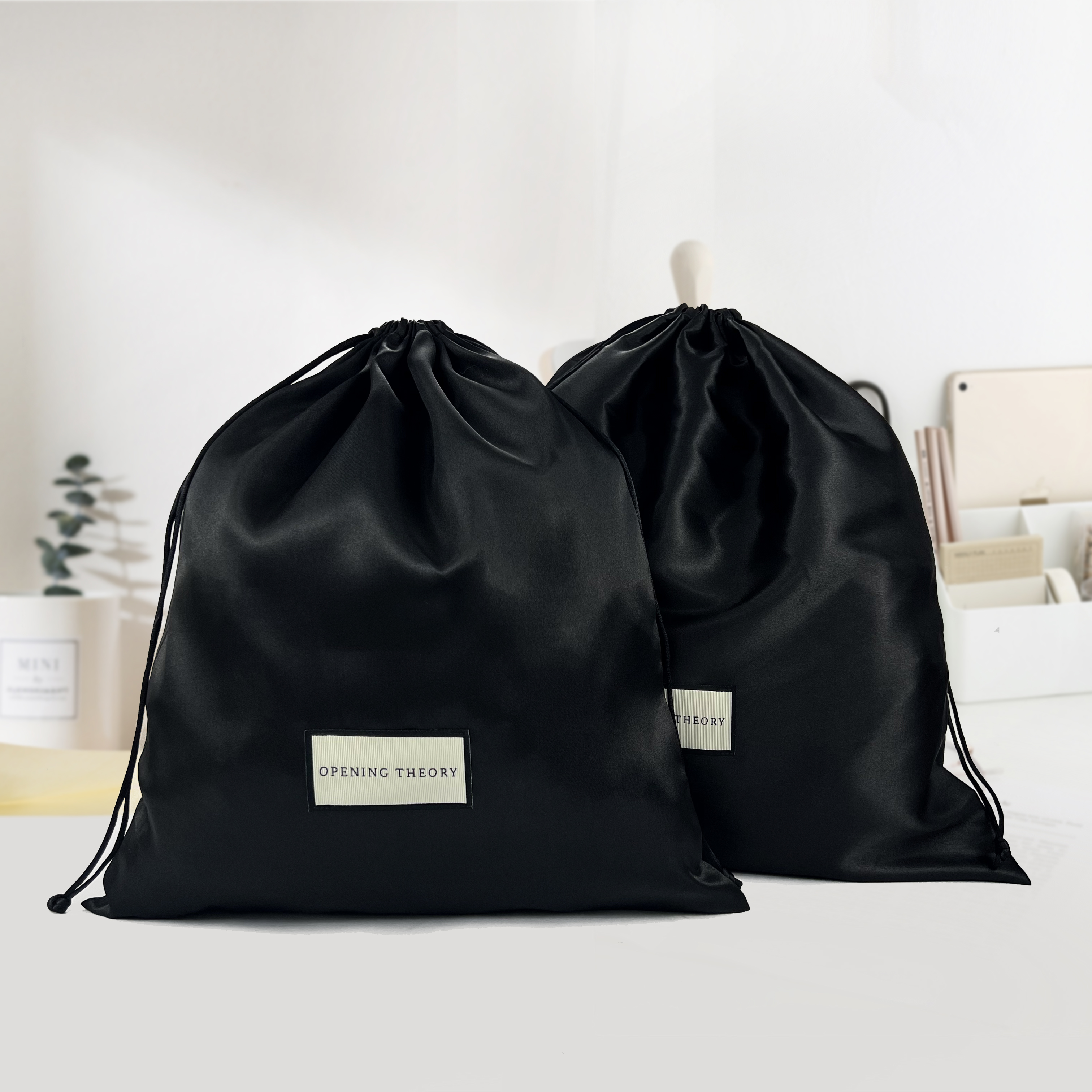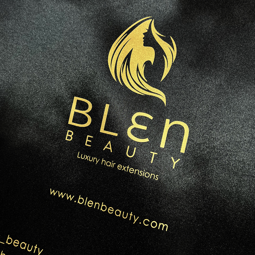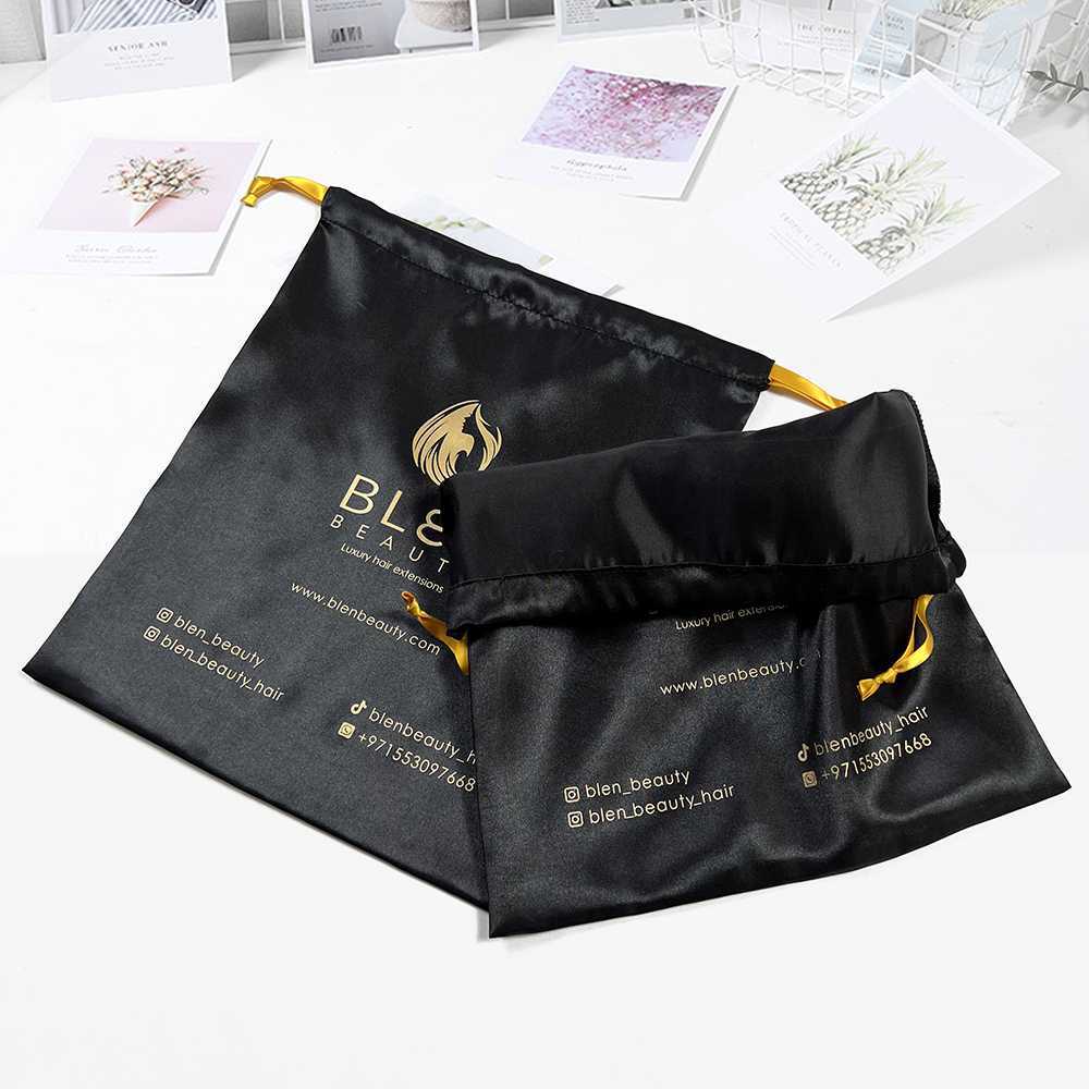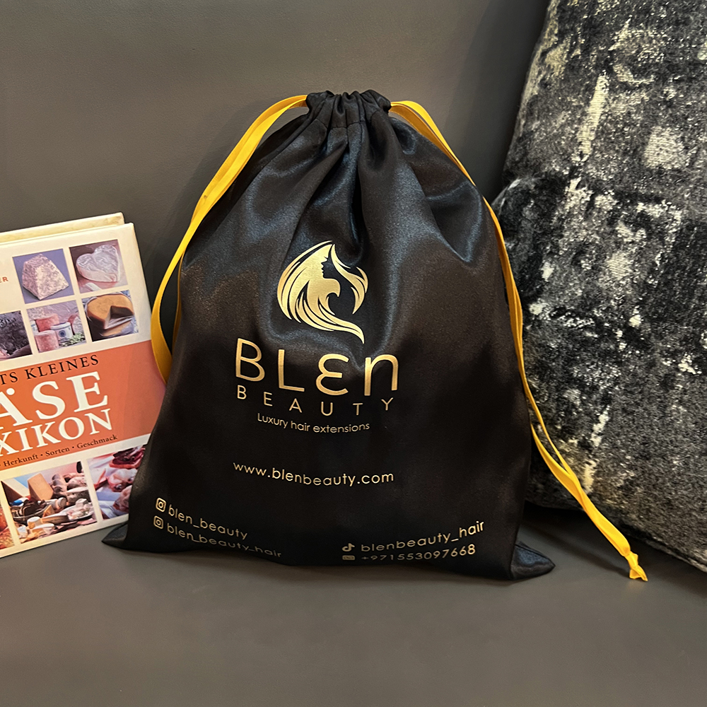 Elevate your packaging with this premium black satin drawstring bag, designed for luxury hair extensions, beauty accessories, and boutique products. Crafted from silky, smooth satin fabric, the bag offers a refined sheen and a soft touch, ensuring both protection and elegance. The gold foil-stamped logo adds a sophisticated highlight, enhancing brand visibility and creating an upscale unboxing experience.