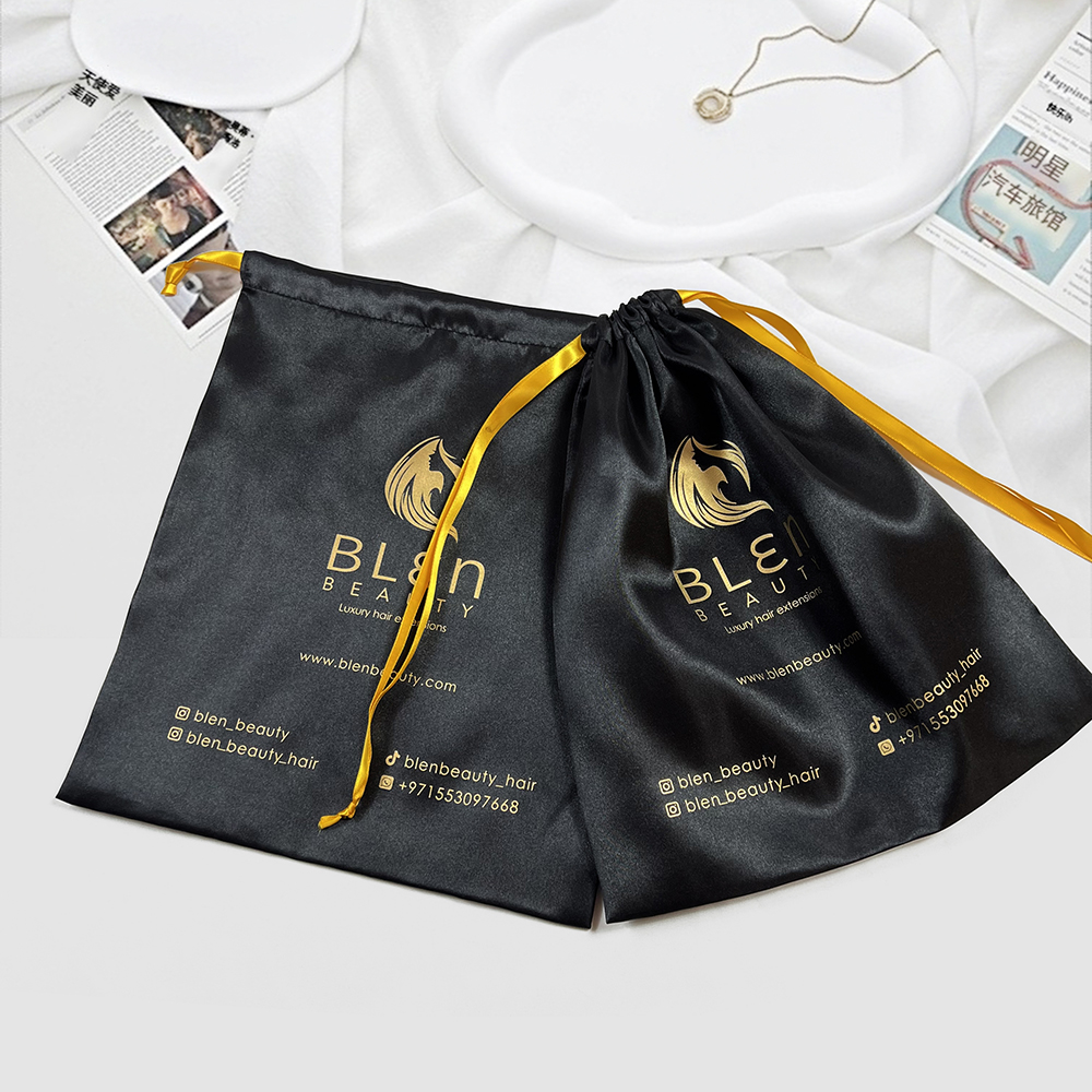 Featuring a durable double-sided satin ribbon drawstring in metallic gold, the bag is easy to open and secure, keeping items safe from dust, tangles, and damage. Perfect for beauty brands, hair extension packaging, jewelry, and personalized gifts.