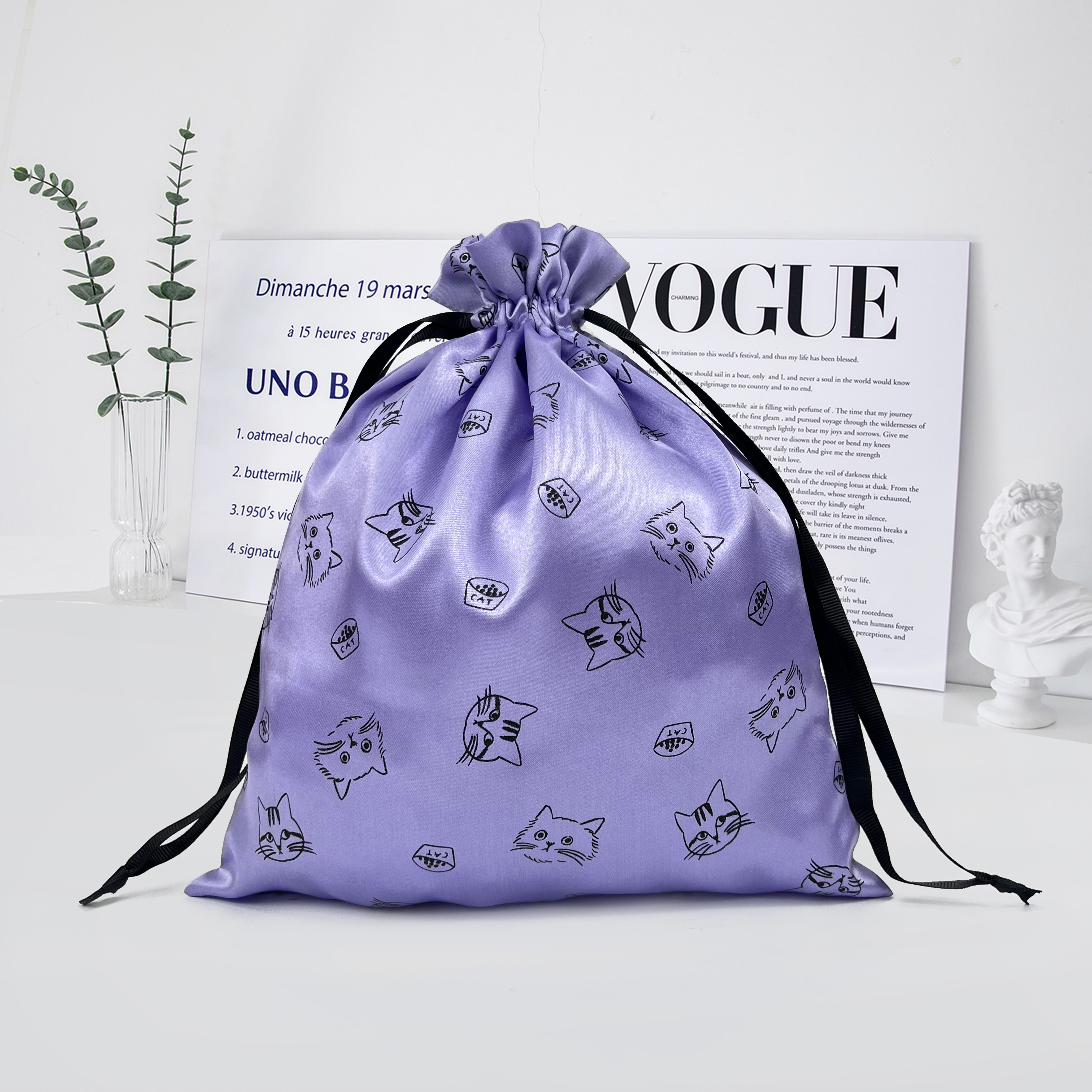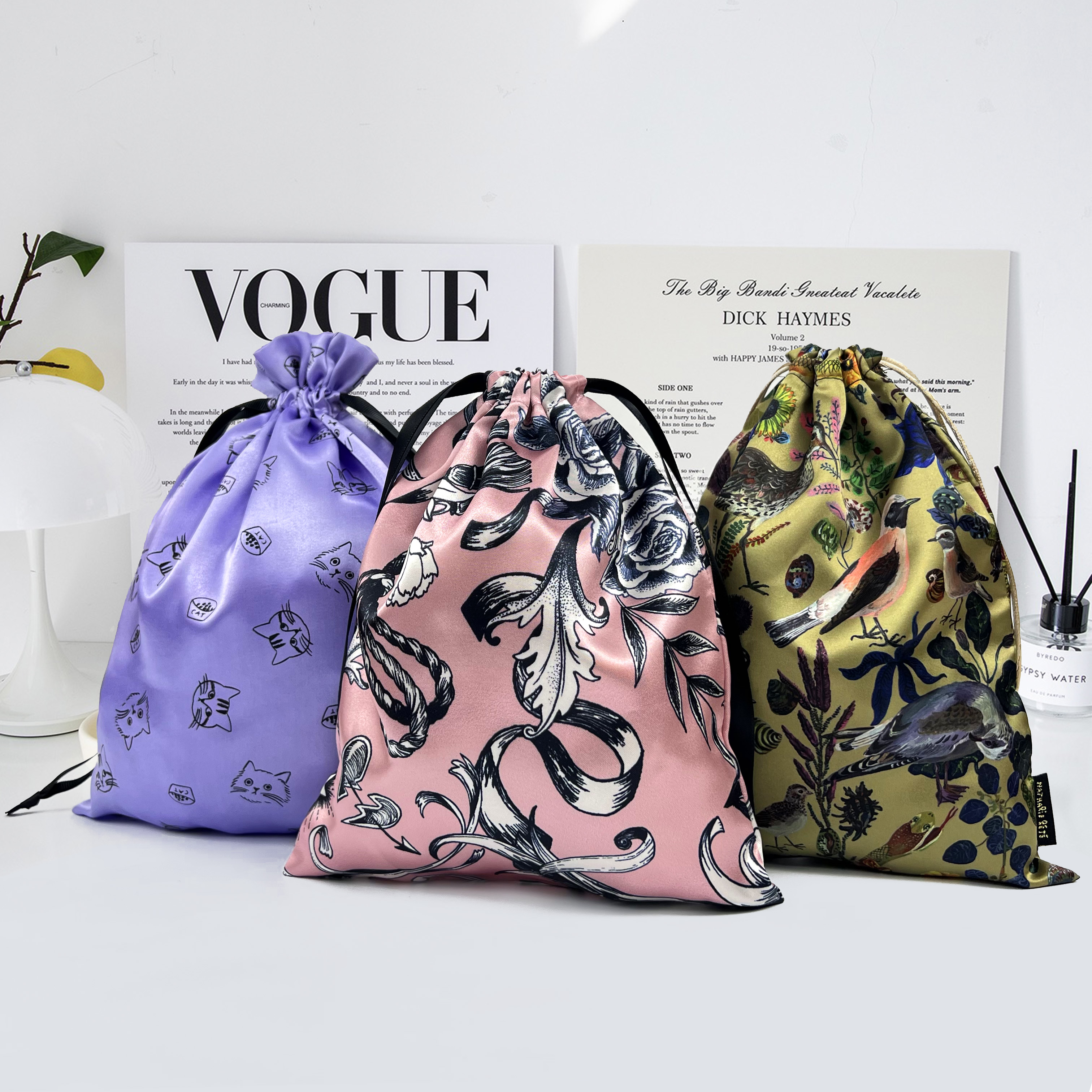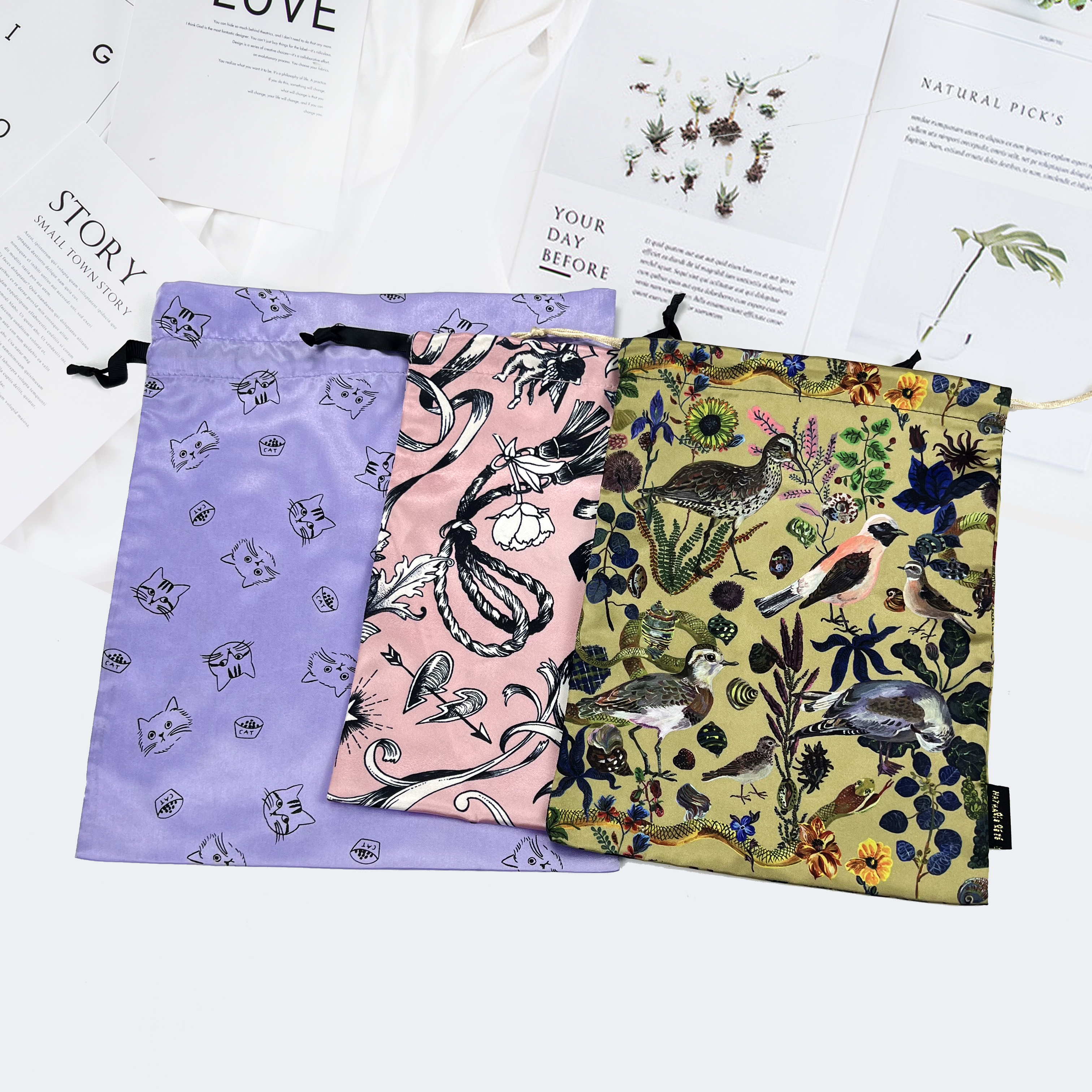 These luxury printed satin drawstring bags combine softness, shine, and artistic design, making them ideal for premium product packaging. The collection includes three unique patterns—a cute purple cartoon cat print, an elegant pink floral design, and a nature-themed golden bird motif. Crafted with silky satin fabric and secure drawstring closures, these bags are perfect for jewelry, cosmetics, accessories, and upscale gift packaging. Custom designs and branding options are available to elevate your product presentation.