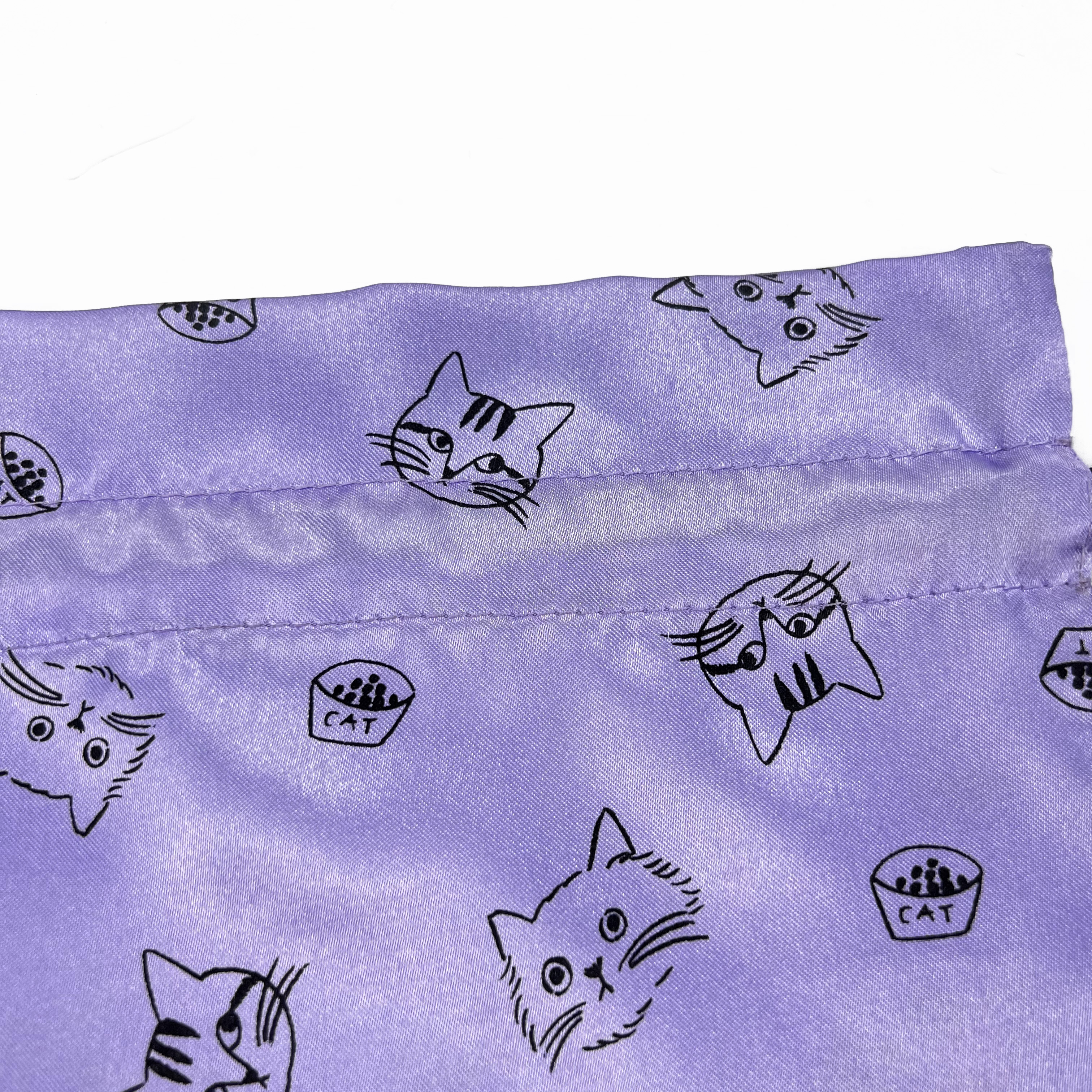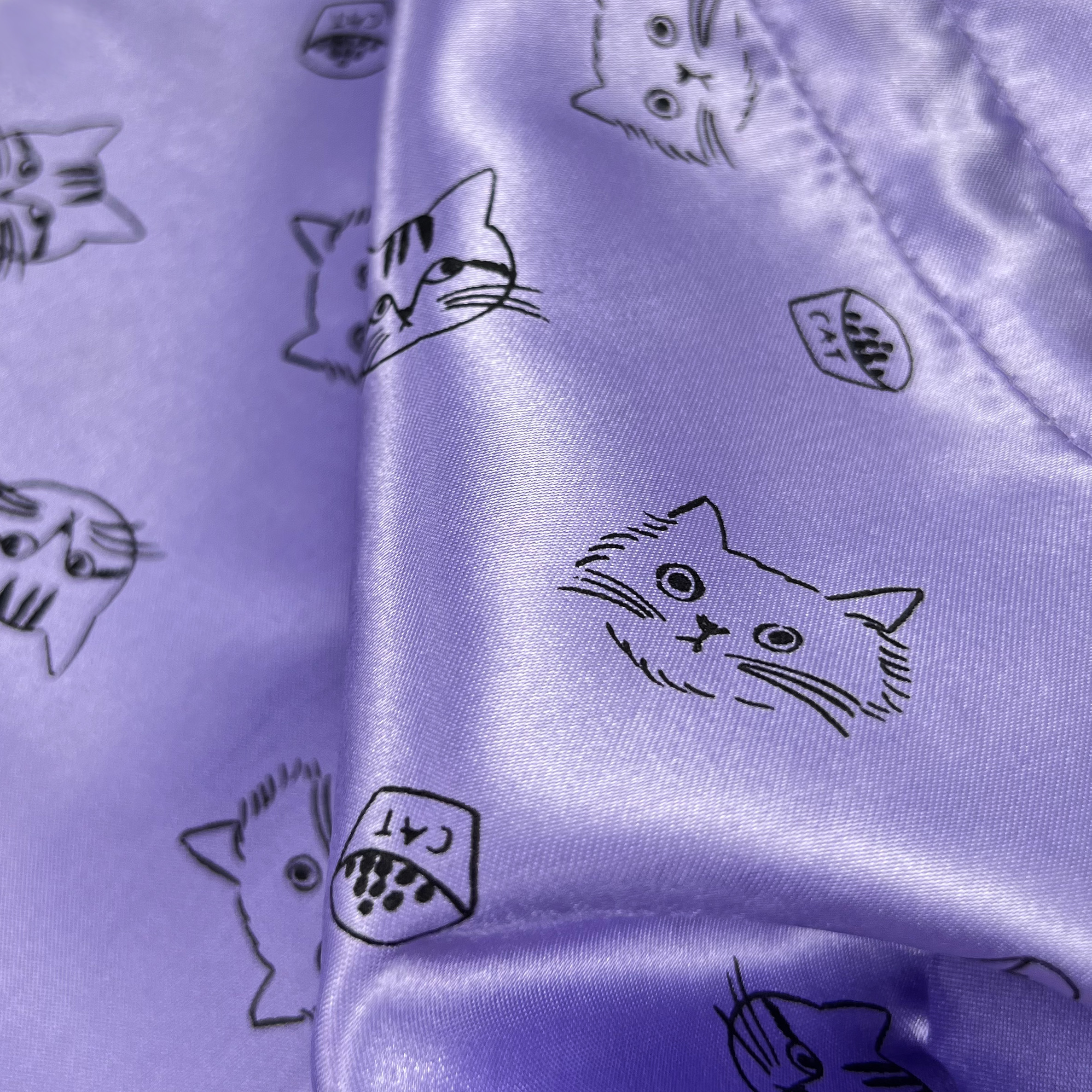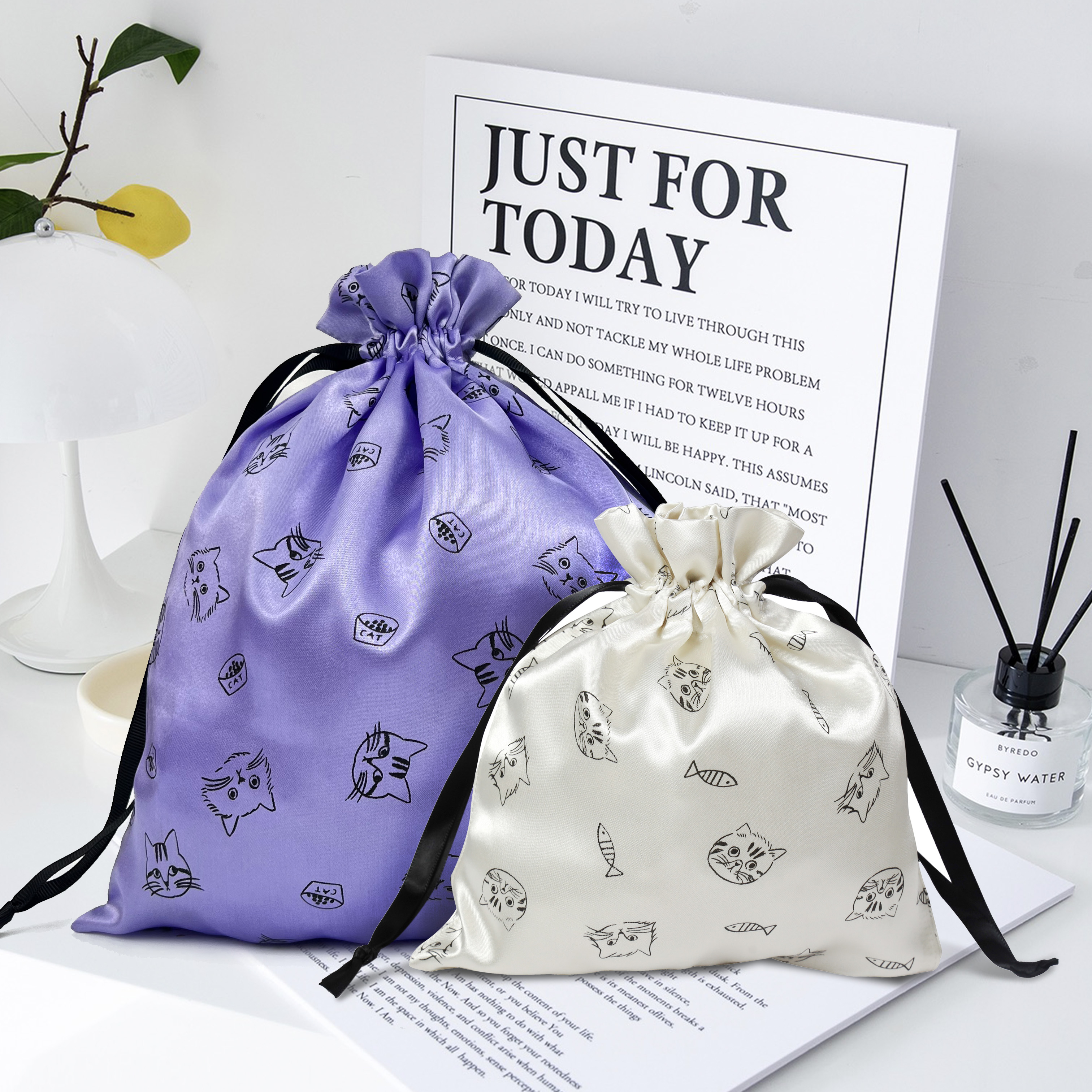 These luxury printed satin drawstring bags combine softness, shine, and artistic design, making them ideal for premium product packaging. The collection includes three unique patterns—a cute purple cartoon cat print, an elegant pink floral design, and a nature-themed golden bird motif. Crafted with silky satin fabric and secure drawstring closures, these bags are perfect for jewelry, cosmetics, accessories, and upscale gift packaging. Custom designs and branding options are available to elevate your product presentation.