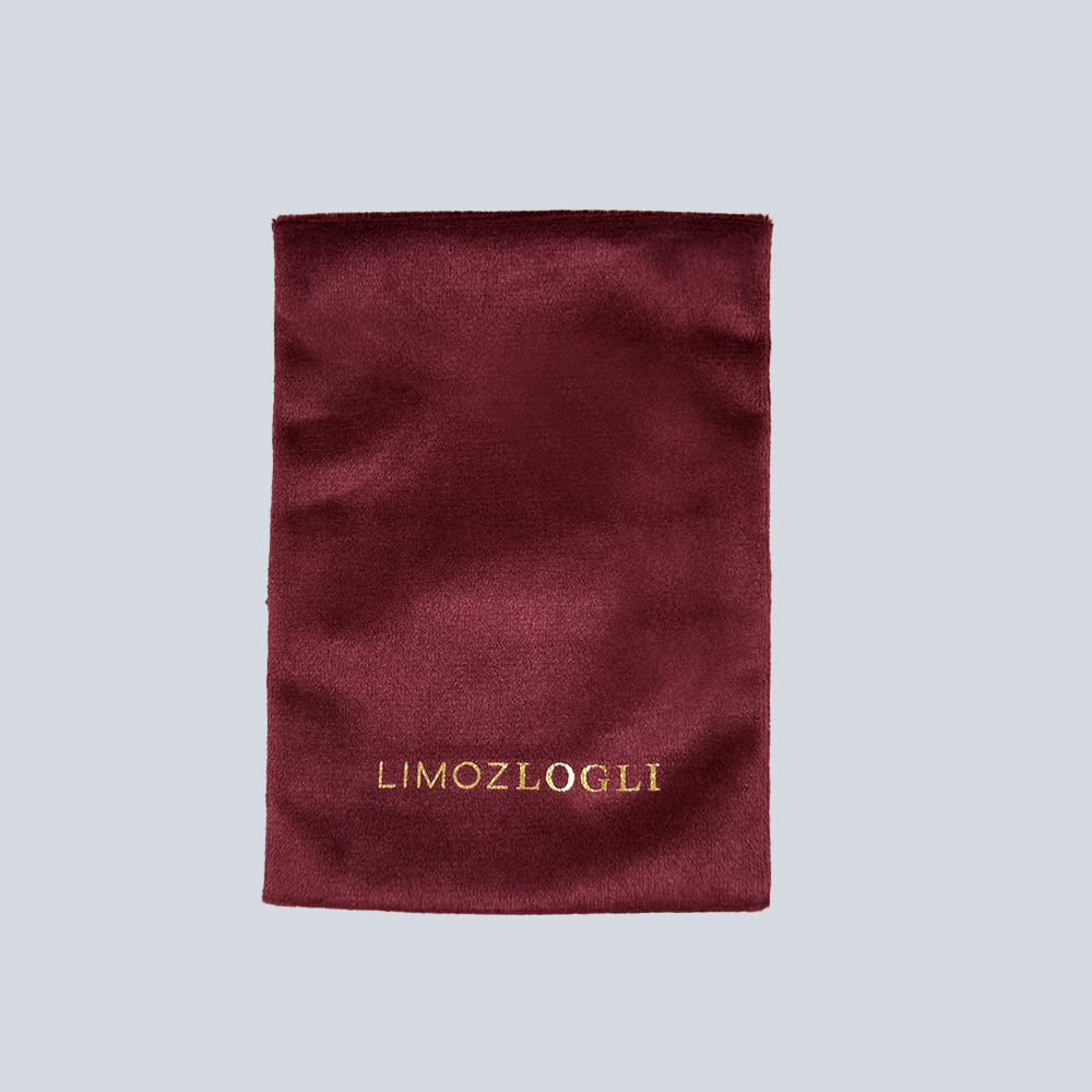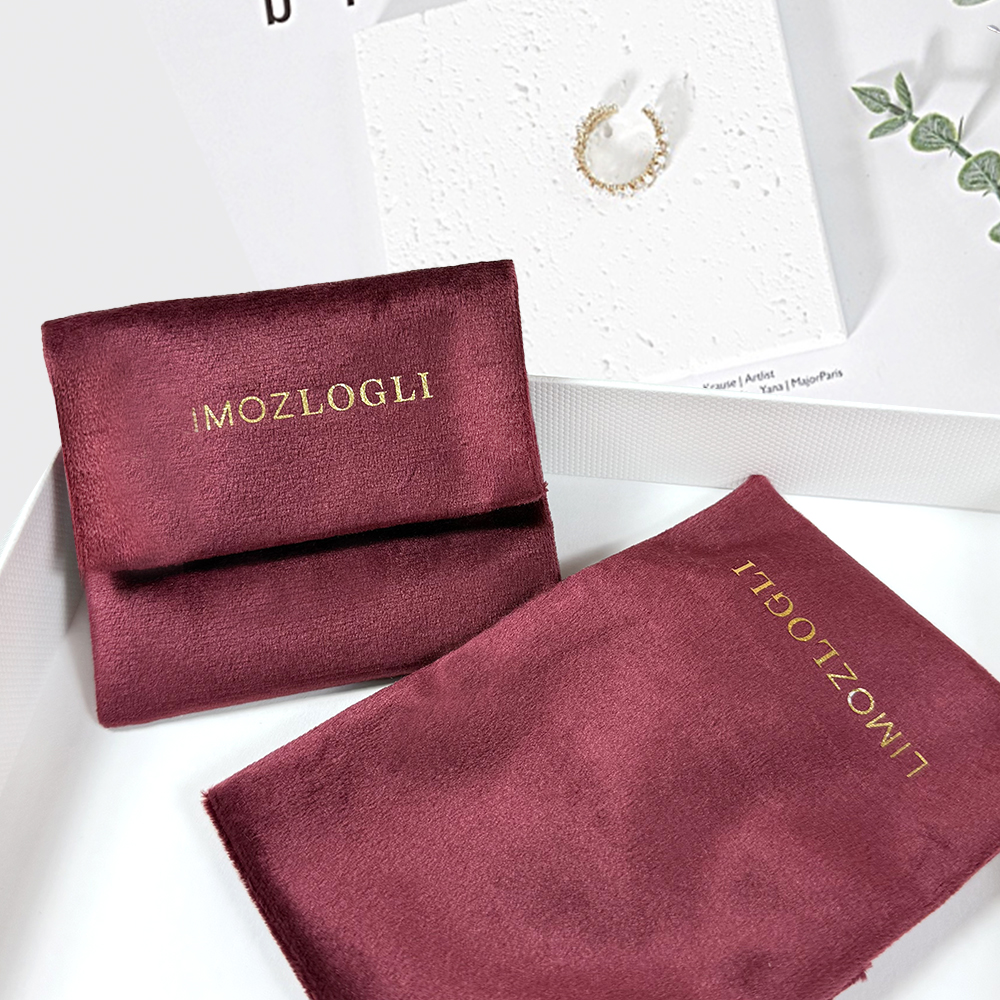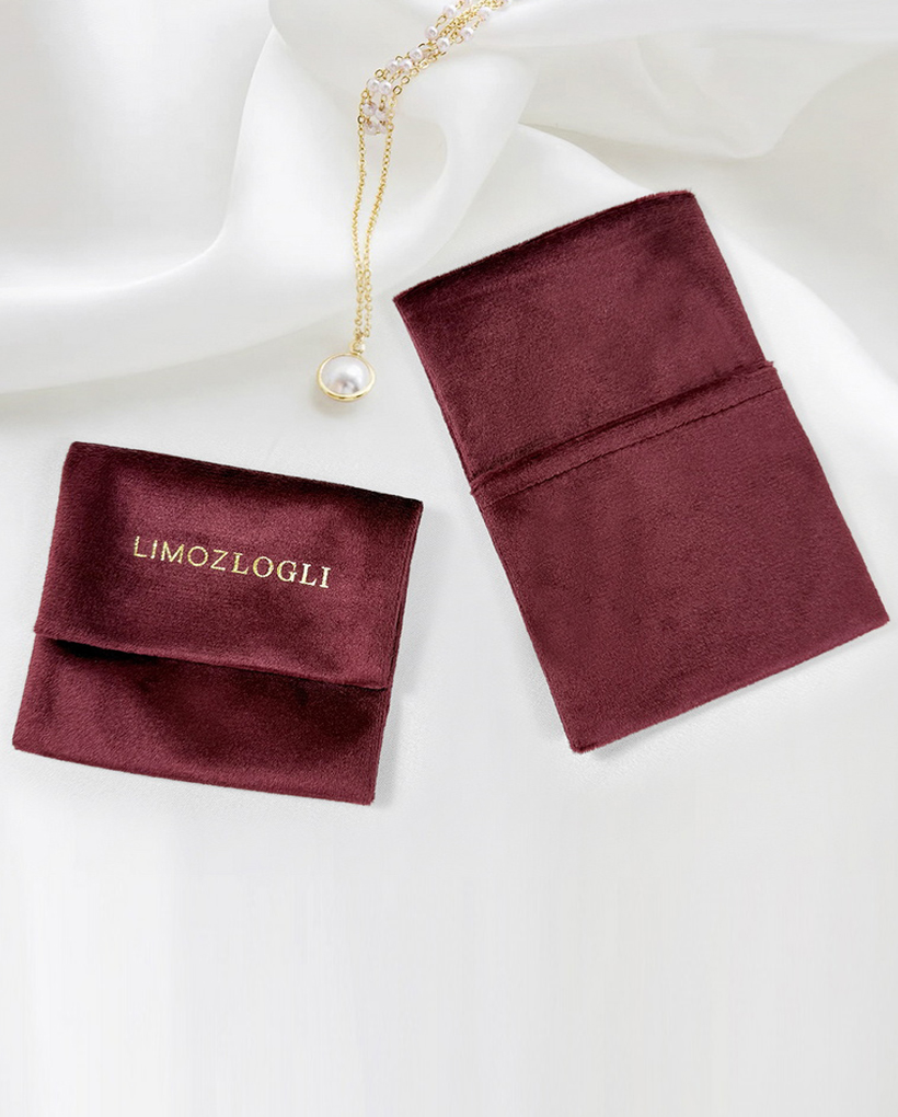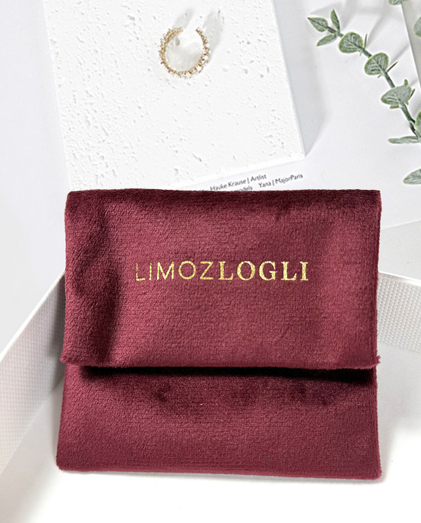 This burgundy velvet envelope pouch is designed for jewelry storage, featuring a luxurious gold foil logo and trendy Korean style color scheme; made of soft and durable velvet, it securely holds necklaces, bracelets, rings, and other small jewelry items while adding an elegant touch, ideal as a gift for birthdays, anniversaries, or special occasions, combining functionality with stylish design to protect and showcase your precious jewelry.